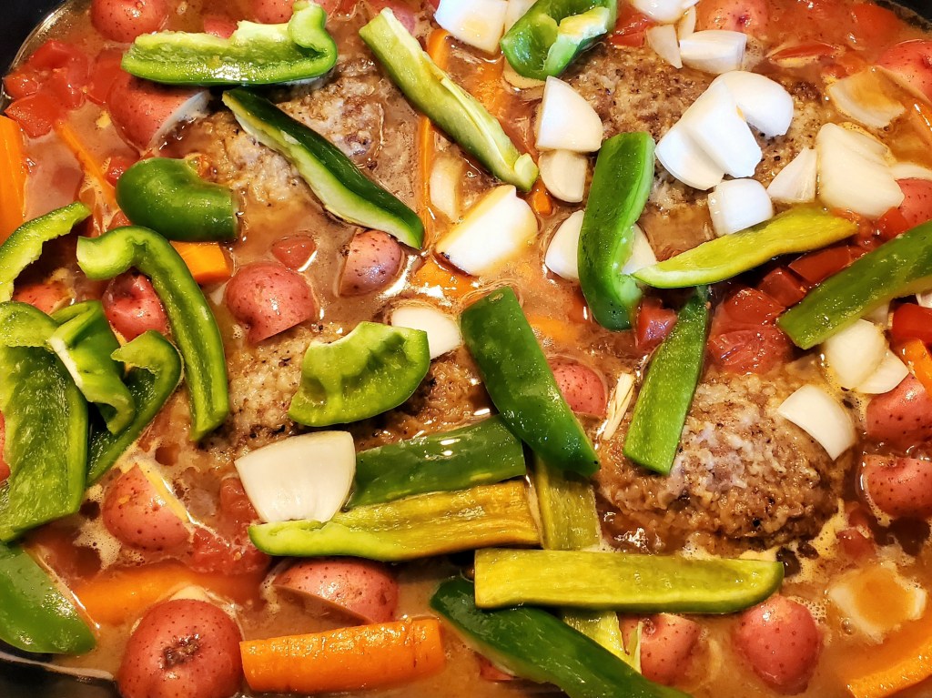 - Add the tomatoes (juices and all), onions, bell pepper, carrots, and potatoes. Season with salt and pepper as needed. Simmer on low heat, covered, until vegetables are tender. About another 30 minutes.