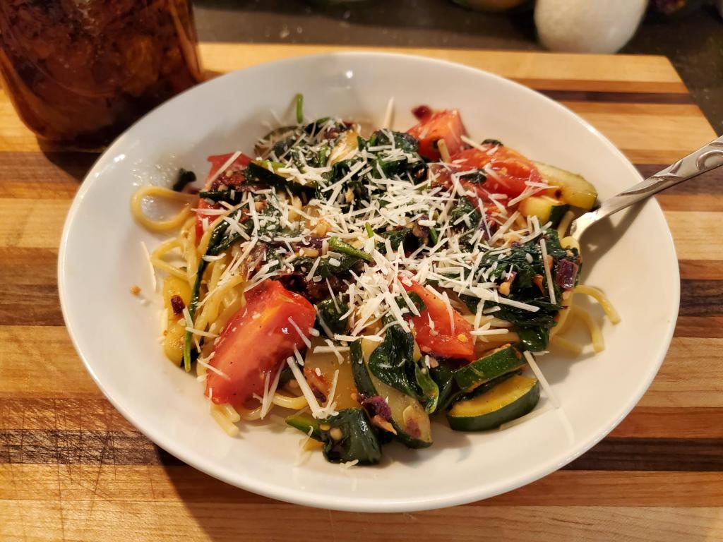 - You can either stir your pasta in at this point, or keep it separate and plate it, topping off with the veggie mix.
