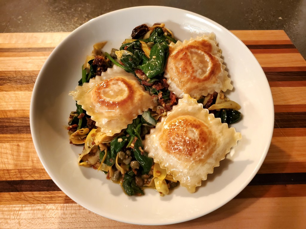 One response to “Butternut Squash Filled Ravioli Over Spinach, Artichokes, Capers, and Sun-Dried Tomatoes”
